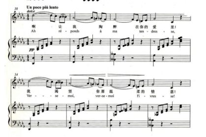 B段为这首咏叹调情绪抒发的高潮部分。演唱时须注意开始处U n poco piu lento和dolce的标记。开始两句半音阶下行的旋律,是在A段结尾的长音情绪基础上形成的。在B段演唱时,有很多下行的半音阶,暗示着在爱情的背后酝酿着一个阴谋。