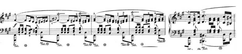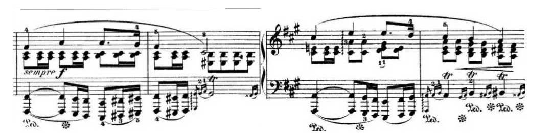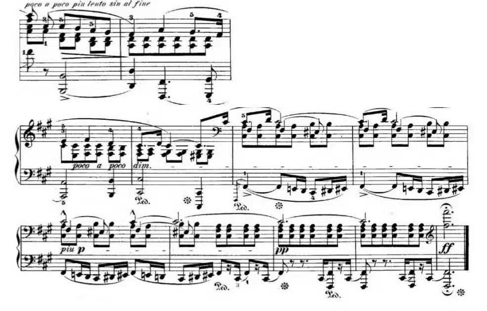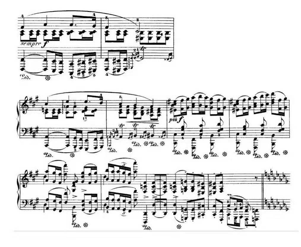 从127小节开始犹如进入了另一副画面,从刚刚的战争场面进入了一片祥和的田园。可见和声有塑造音乐形象的作用,以这首作品为例肖邦多采用复杂结构的和弦塑造恐怖杀戮、激烈斗争的形象;当采用和声结构较为简单的大小三和弦大多展示平静安详、庄严肃穆的形象。