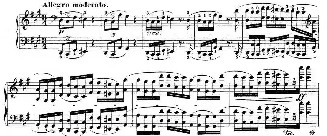 和声有为音乐发展提供动力的功能。除了上面讲道的和声色彩,不同结构的和弦还可以影响音乐的紧张度。如这首《波兰舞曲op44》中在旋律的不断递进中展示从松弛到紧张,又从紧张回到松弛音乐效果的变化。这种音效紧张度的变化就像海浪推动着旋律以不同的幅度和频率直到结束。普通来说,越简单的和声结构听起来更松弛,反之更紧张。